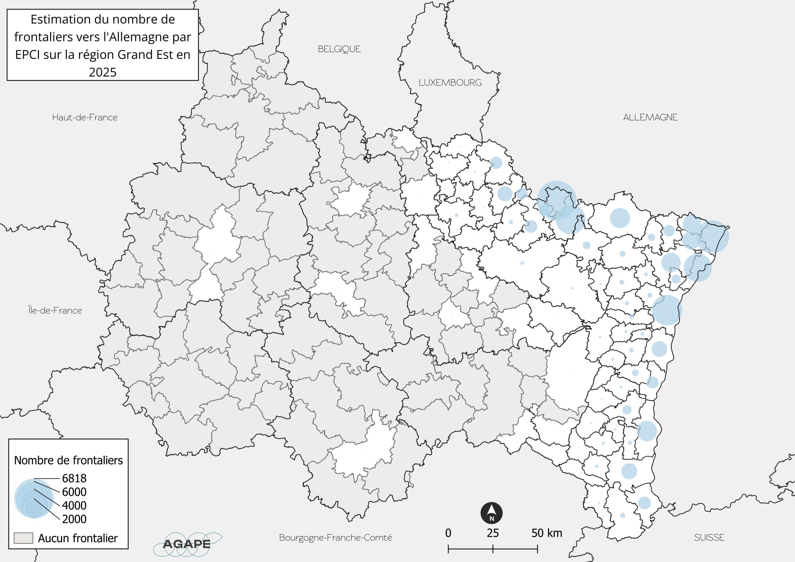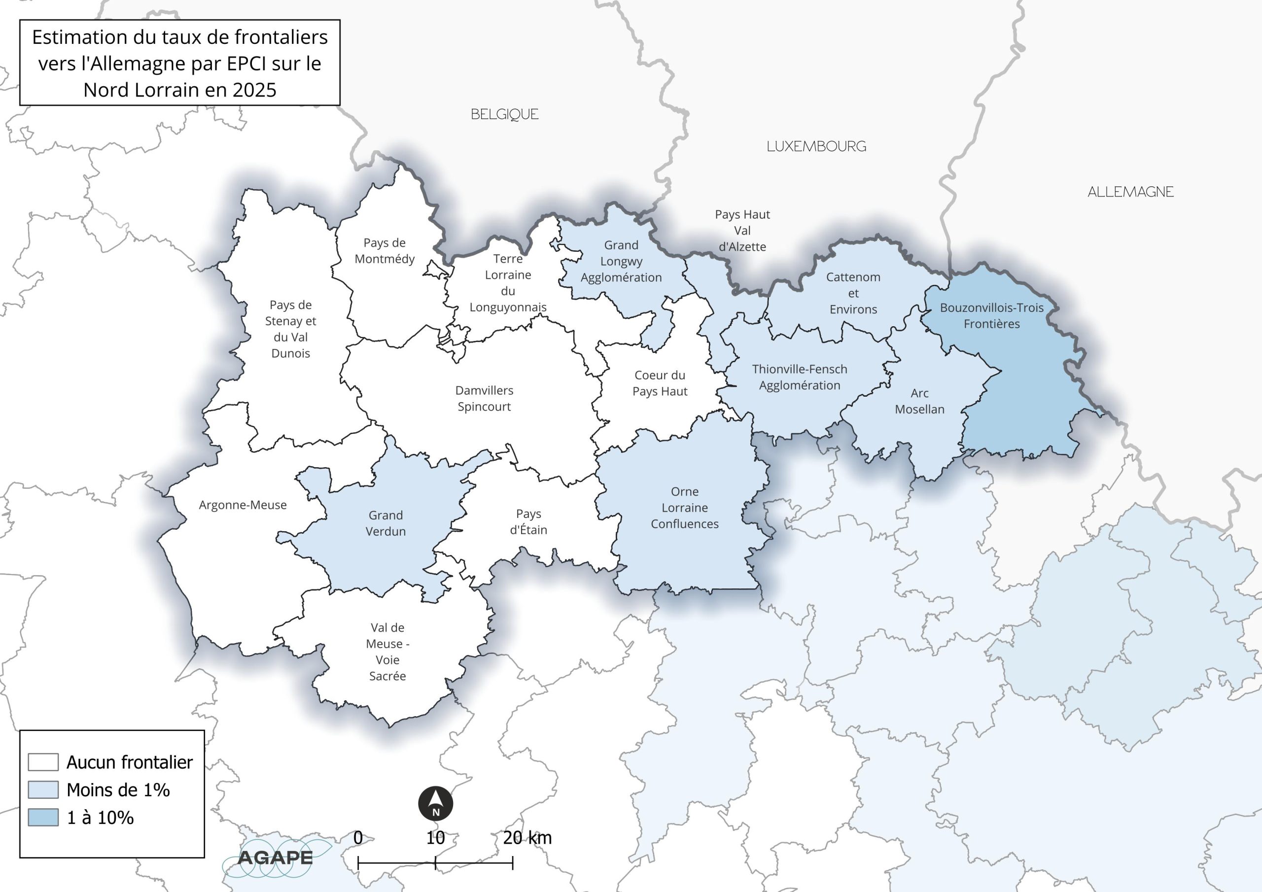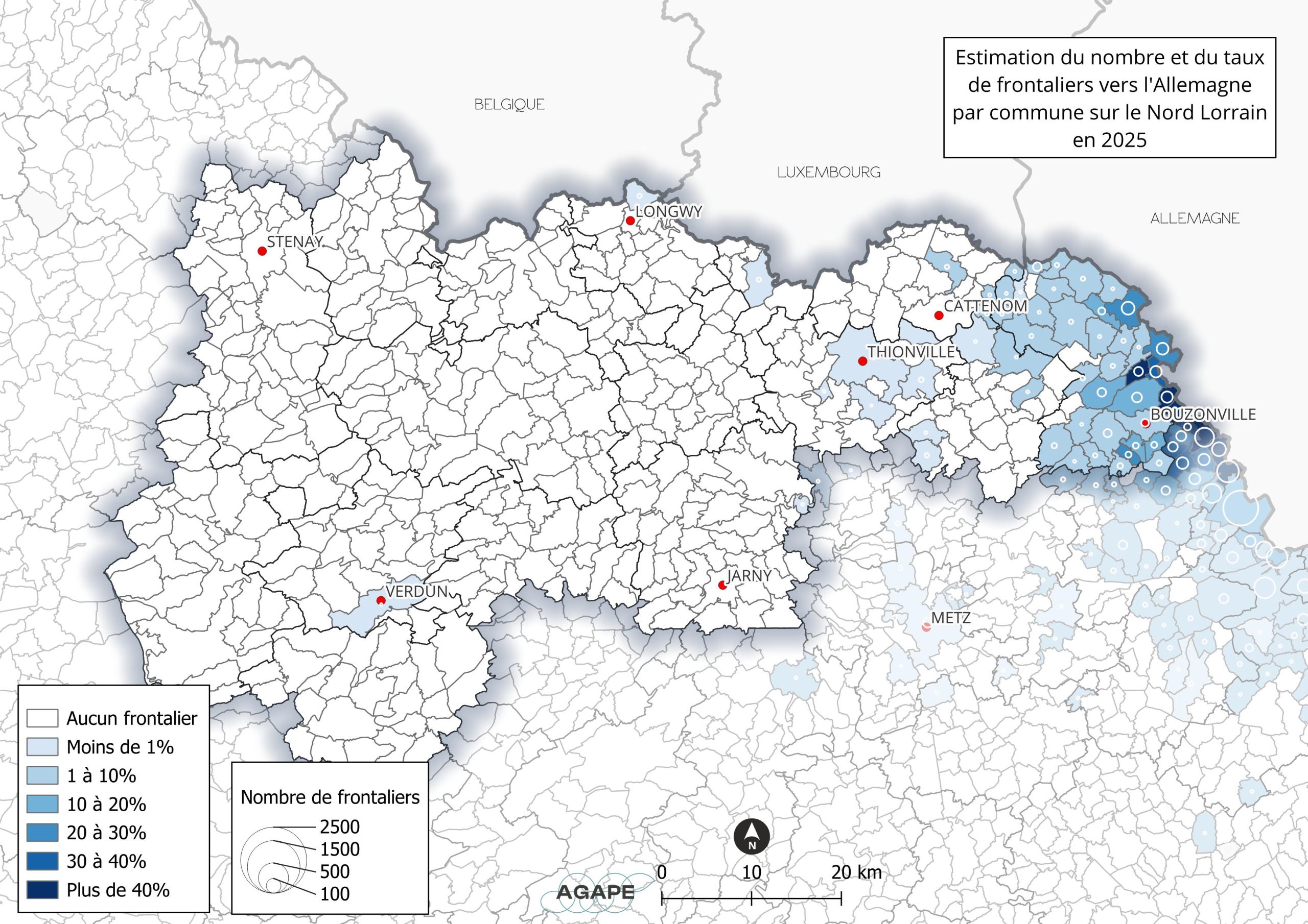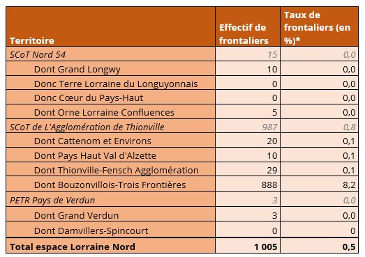 En 2025, le Grand Est compte 220 800 travailleurs frontaliers dont 48 600 vers l’Allemagne. Seuls 2% de ces travailleurs résident sur le Nord Lorrain, et résident presque exclusivement sur le Bouzonvillois-Trois Frontières.